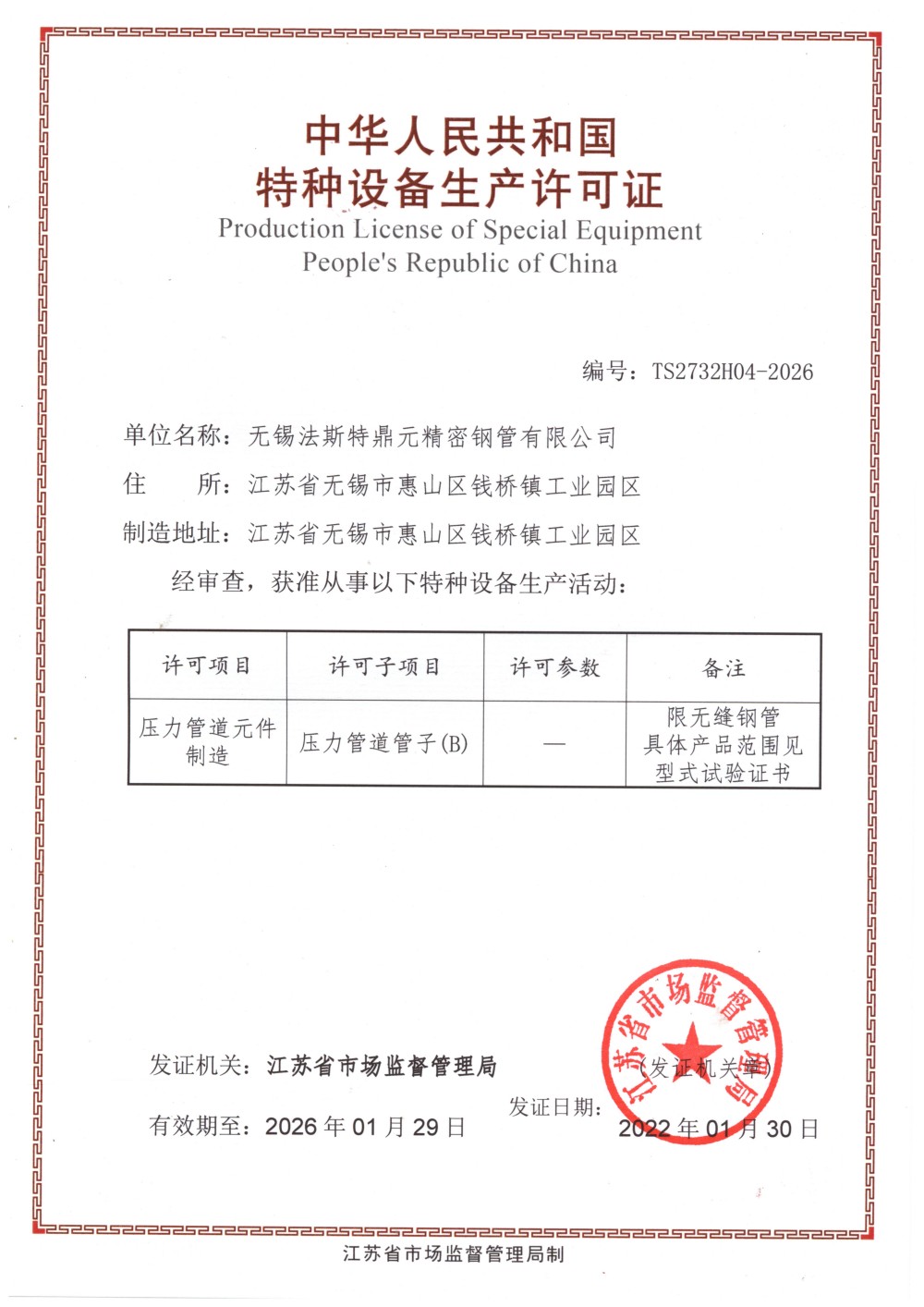 公司目前持有:中國質(zhì)量認(rèn)證中心CQCISO9001:2015質(zhì)量管理體系認(rèn)證,國家質(zhì)量檢驗(yàn)檢疫局TSG特種設(shè)備體系認(rèn)證,歐盟TUVNORD PED 以及美國石油協(xié)會(huì)API5CT/API5L會(huì)標(biāo)產(chǎn)品許可證。