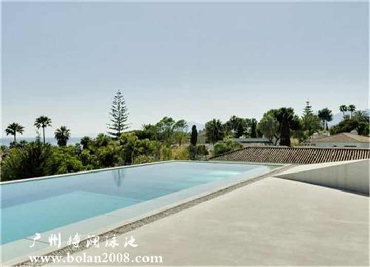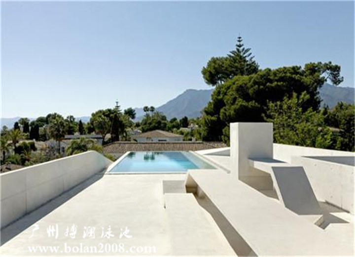 西班牙地中海岸城市馬貝拉的一棟建筑,業(yè)主希望能夠在家中看到海岸和沙灘,享受游泳和日光浴的樂趣;但是鄰居的房子遮擋了業(yè)主屋頂遠(yuǎn)眺海岸的視線,為了解決這個(gè)問題,建筑師設(shè)計(jì)出了一個(gè)巨大的懸臂梁結(jié)構(gòu)托起的屋頂和泳池。